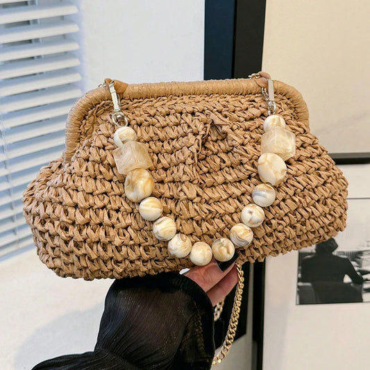 Bolsa de Palha Trançada com Alça Marmorizada e Corrente Dourada