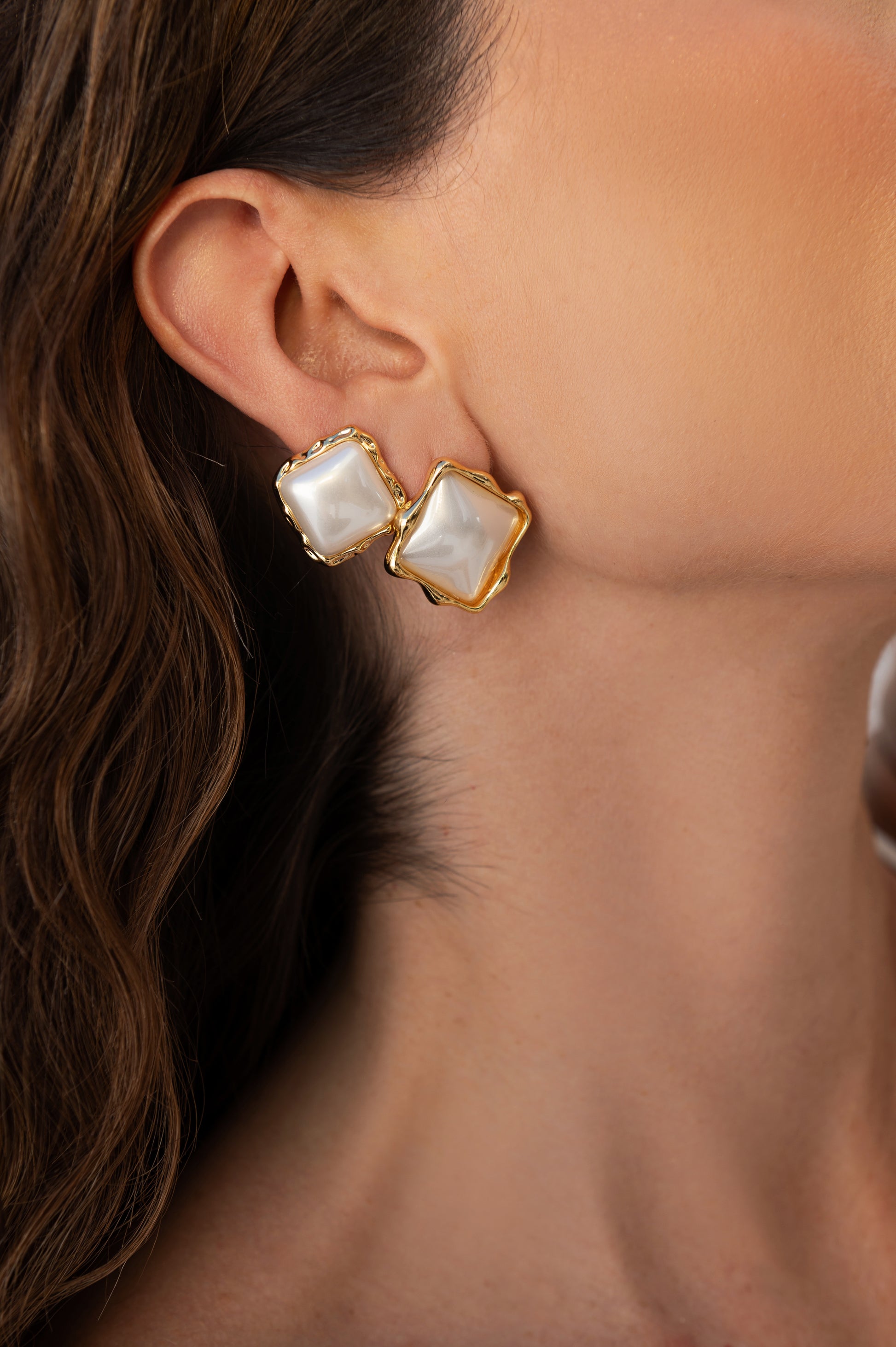 Brinco Pérola Dourada Quadrada